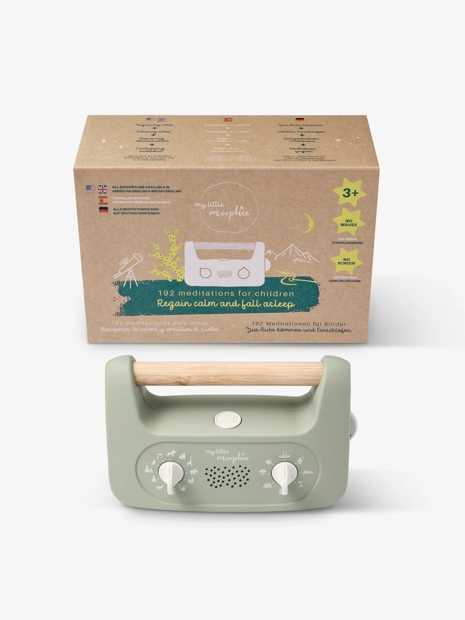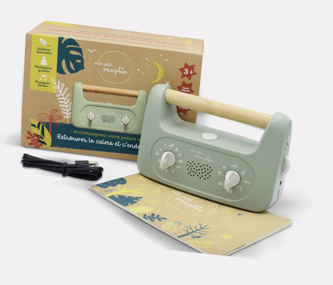 Mein kleiner Morphee enthält 128 beruhigende Geschichten, 32 geführte Meditationen, 16 sanfte Musikstücke und 16 Naturgeräusche, um Ihrem Kind das Einschlafen zu erleichtern.