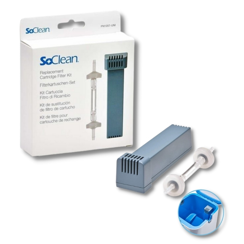 Filterpatronenset mit Ersatzfilter inkl. O-Ring und Ersatz-Rückschlagventil. Das Set sollte alle sechs Monate ausgetauscht werden. Geeignet für alle SoClean-Geräte mit der Seriennummer „1200SC“.